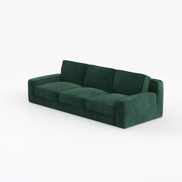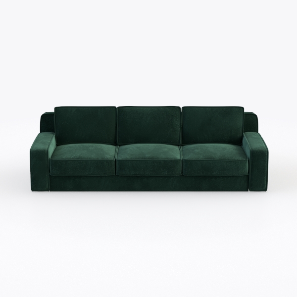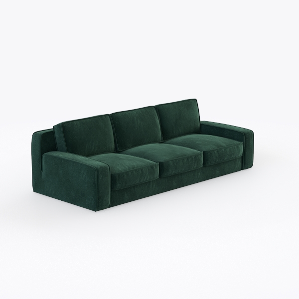 Inspired by the serene depths of a forest canopy, this sofa blends organic warmth with modern simplicity. Its plush velvet upholstery—rich in an emerald green hue—boasts a tactile allure: soft to the touch yet subtly structured, creating an inviting surface that feels both luxurious and grounded. Clean, unadorned lines define its silhouette, with squared arms and a streamlined profile that strike a balance between boldness and restraint, making it a striking yet harmonious focal point in any space.