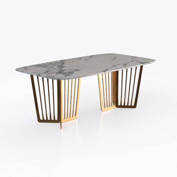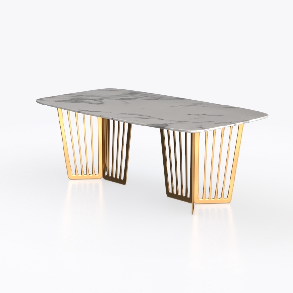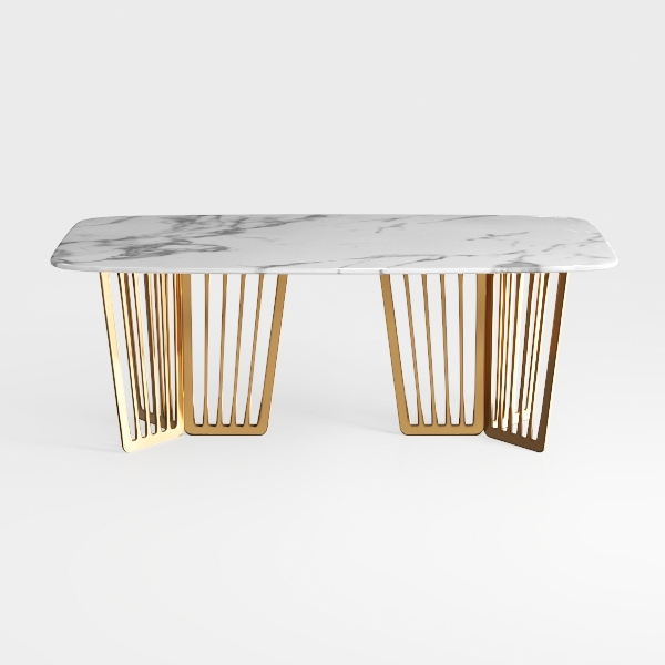 Designed to blend natural stone's organic patterns with geometric precision, this piece features a marble top offering smooth, cool touch and subtle gray veining. Golden metal legs, sleek and lightweight, add warm contrast. Ideal for modern-luxury living rooms or foyers, complementing minimalist sofas and metallic accents. Spacious surface holds decor/books, with stable, airy legs balancing style and utility.