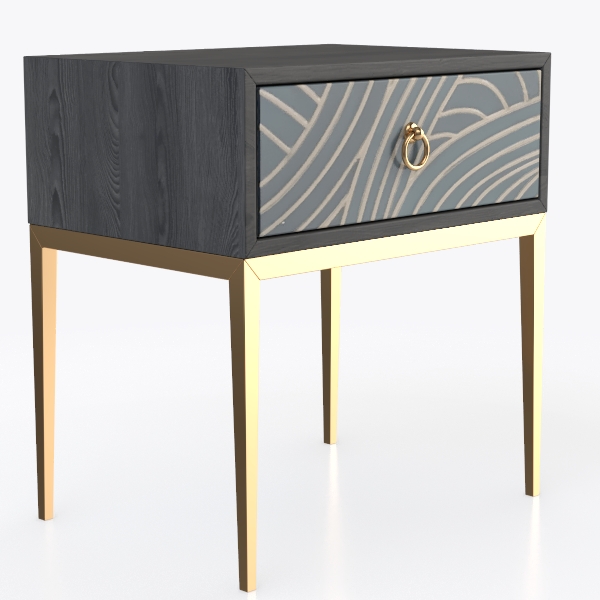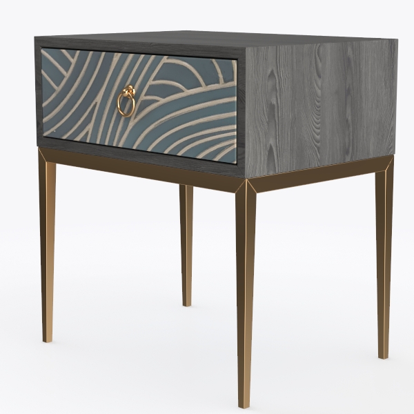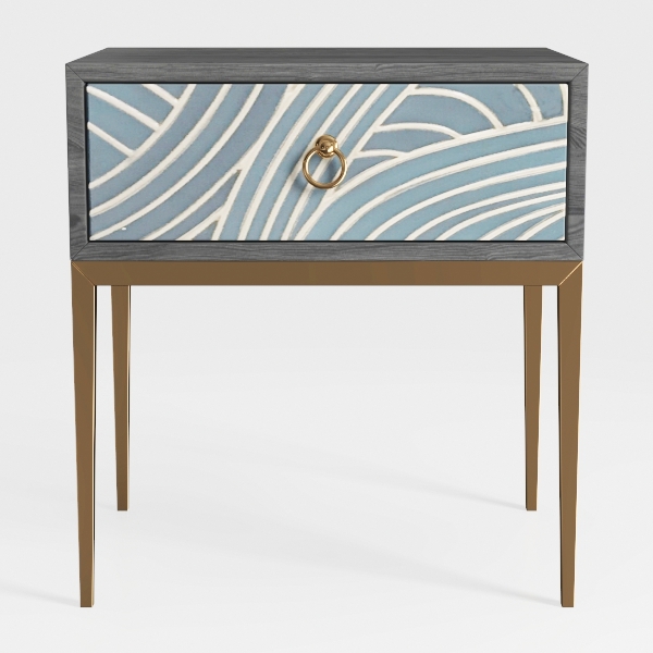 Inspired by the fluid motion of ocean waves, this cabinet features warm wood grain edges, a smooth gold metal handle, and a textural drawer front with soft blue and white wave patterns, creating a calm, layered look. Ideal for a modern minimalist bedroom, pairing beautifully with linen bed linens and subtle wall decor, it offers practical storage via a single drawer, while slender gold legs keep it light yet sturdy.