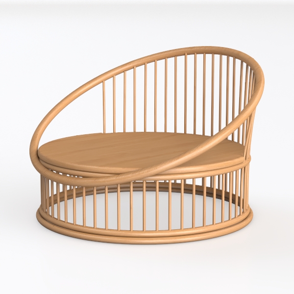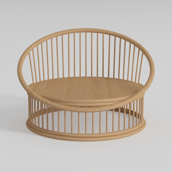 This elegant piece draws inspiration from organic, flowing forms, merging modern simplicity with the warmth of natural craftsmanship. The frame, crafted from light, smooth wood, features slender, evenly spaced slats that curve gently to create a soft, circular silhouette, evoking the calm of a quiet forest glade or the artistry of traditional weaving.