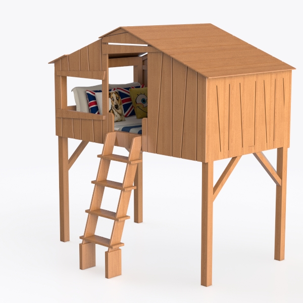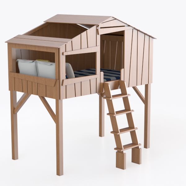 Inspired by childhood treehouse dreams, this elevated bed blends warm wooden texture with soft, natural lines. Its smooth surface and playful, elegant design evoke a cozy, inviting vibe. Ideal for a whimsical kids' room, it pairs perfectly with pastel decor and plush cushions. The sturdy ladder adds a fun climbing element, while the elevated structure frees floor space, balancing functionality and charm.