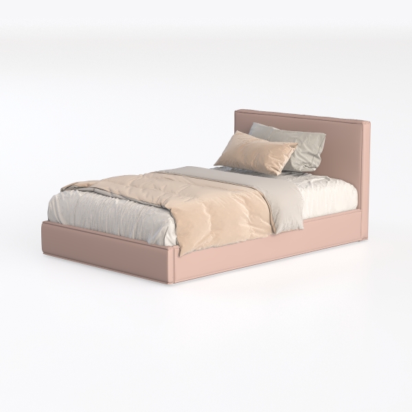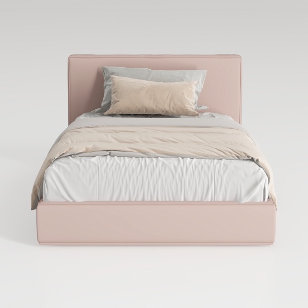 A bed inspired by soft, flowing natural forms, with blush pink velvety upholstery, smooth lines, and a plush headboard for relaxation. Its deep, padded frame ensures ultimate comfort, while light wooden furniture and linen bedding enhance a serene, minimalist vibe. Ample under-bed storage adds practicality to this cozy, stylish piece.