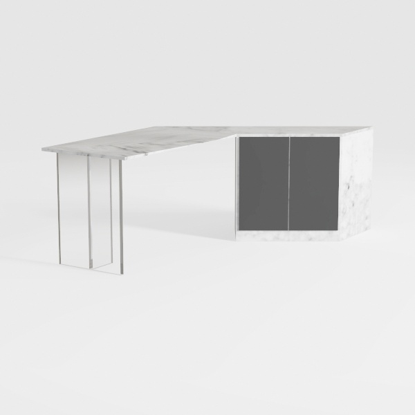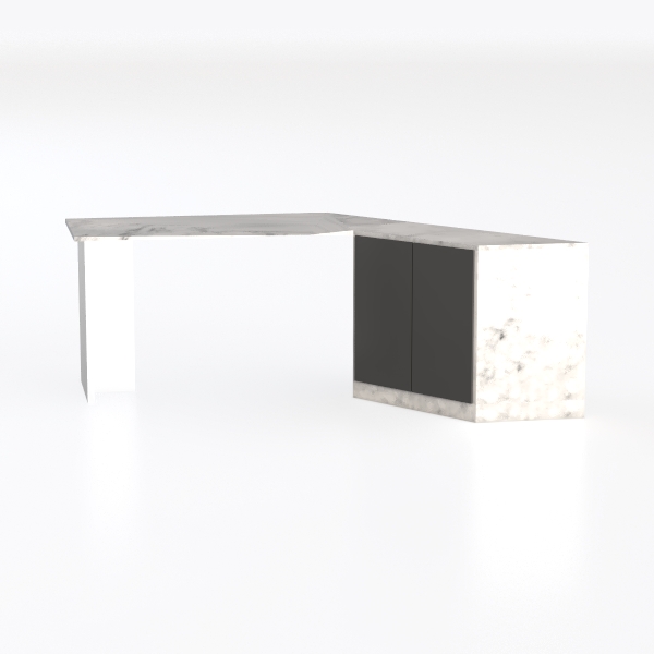 Inspired by Scandinavian minimalism, this piece merges a smooth marble top with matte black cabinet fronts. Its cool, veined marble surface reflects light softly, while slender metal legs add a modern touch. Ideal for a minimalist home office or living room, pair with wooden shelves and linen cushions. The L-shape design maximizes workspace, and closed cabinets offer hidden storage, balancing form and function seamlessly.