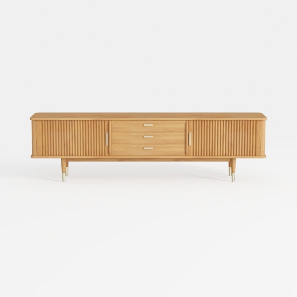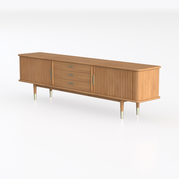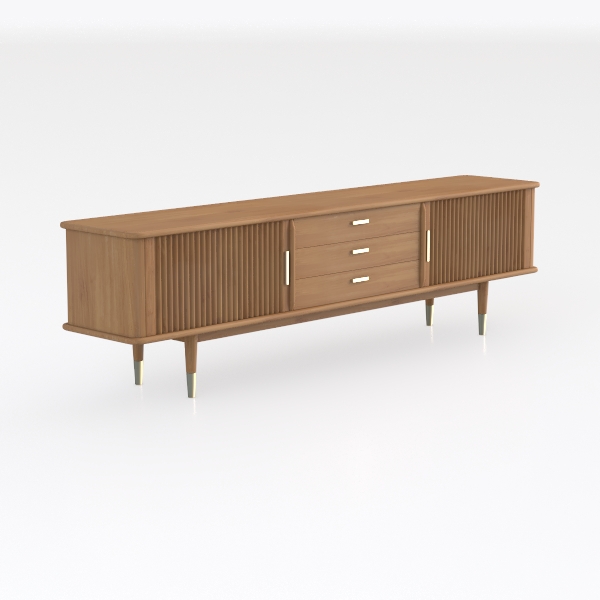 Inspired by mid-century modern design, this wooden cabinet blends warm natural wood grains with clean geometric lines. Its smooth, tactile surface and sleek metal legs balance rustic warmth and modern elegance, ideal for a contemporary living room. Three drawers and two cabinet doors offer ample storage, pairing perfectly with marble coffee tables and linen sofas to create a cozy yet sophisticated space.