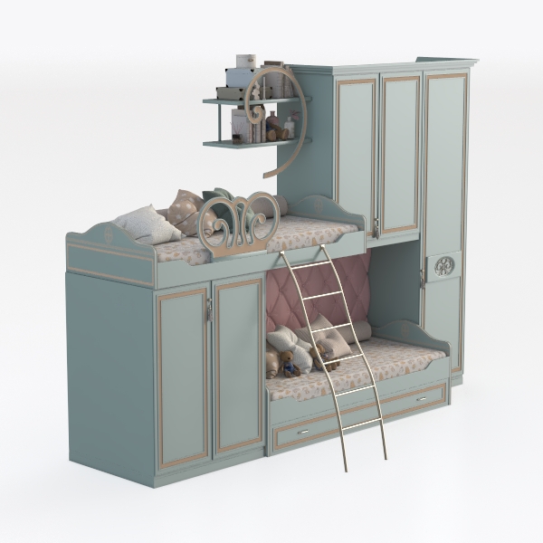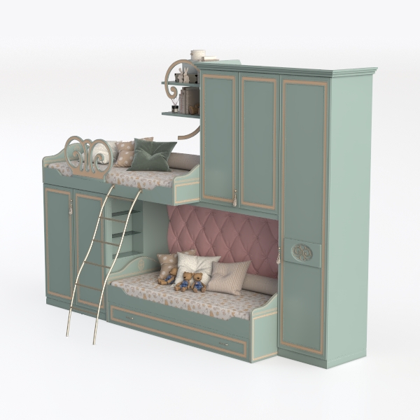 Crafted with fairy-tale charm, this bunk bed blends soft mint green and warm gold accents, inspired by classic childhood dreams. Smooth wood surfaces and quilted pink upholstery create a cozy, tactile feel, while gold trim adds subtle elegance to the light, airy space. Ideal for a girl’s bedroom, it pairs with lace curtains and plush toys, enhancing a whimsical vibe. Integrated storage and a curved ladder ensure functionality, making it both charming and practical for little ones.