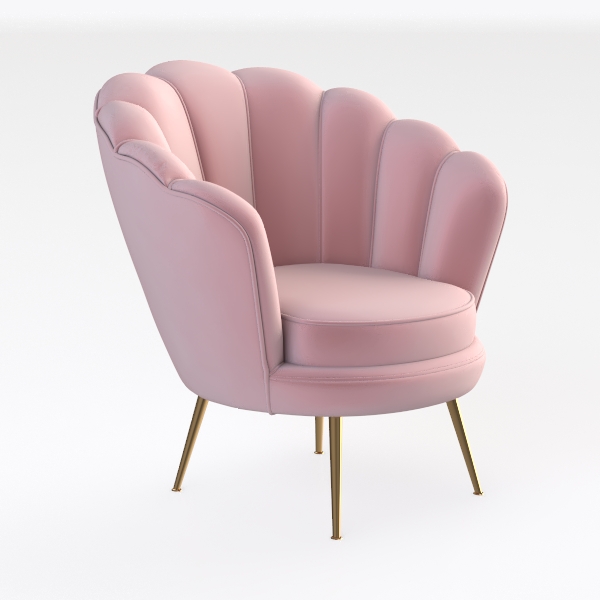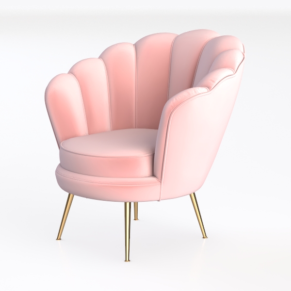 Inspired by natural shell forms, this armchair blends organic curves with modern grace. Soft pink velvet upholstery feels sumptuously smooth, curved backrest wraps gently, offering cozy support. Delicate gold legs enhance its elegance, perfect for modern minimalist or romantic living rooms, pairing beautifully with marble tables and warm lighting. Deep, padded seat ensures ultimate comfort for relaxation.