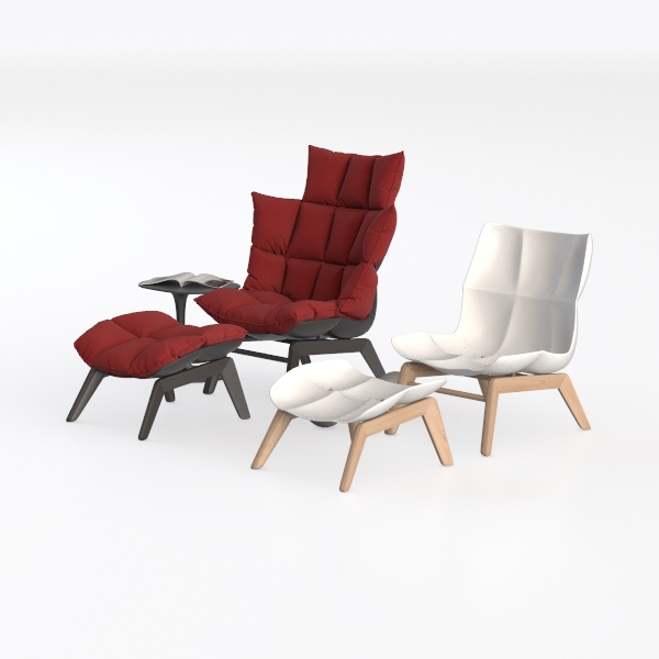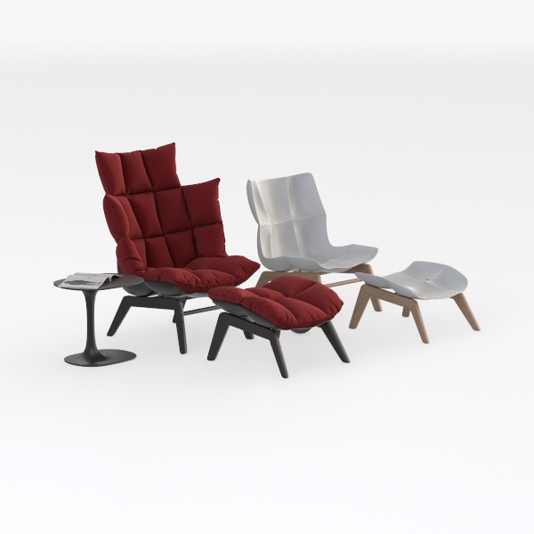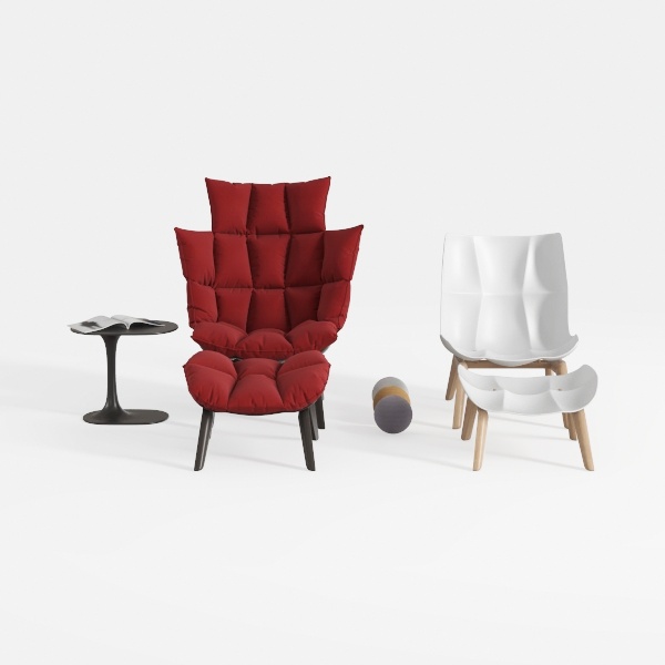 This curated set of home furniture blends organic inspiration with contemporary minimalism. The red chair, with its quilted, square-patterned upholstery, takes cues from the softness of layered textiles, while the white chair’s sleek, flowing lines echo architectural curves, creating a dialogue between comfort and structure.