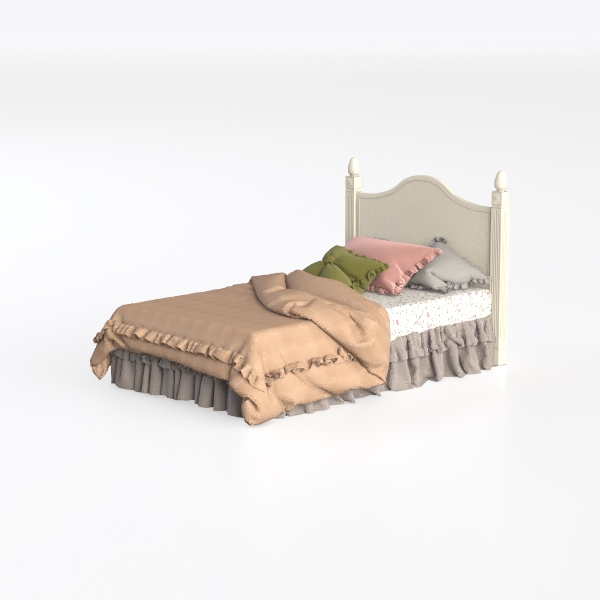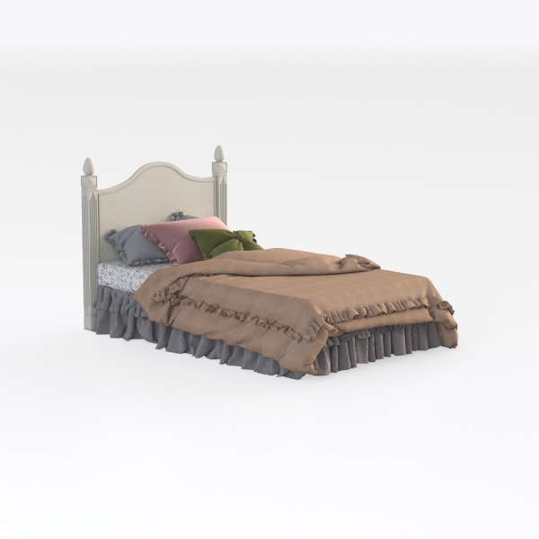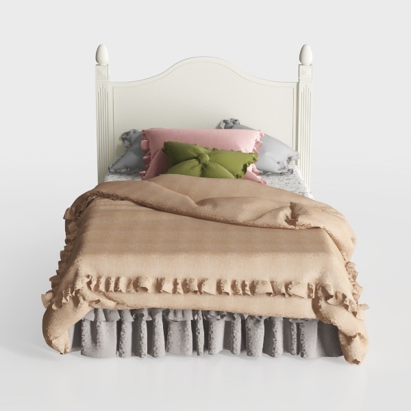 Inspired by soft natural textures and timeless cottage charm, this bed features a curved white headboard and gently ruffled linen-like coverlet. Light, textured fabric with muted pink and green accents, paired with floral-patterned sheets, creates a calm, warm atmosphere. Ideal for a cozy, romantic bedroom, complemented by wooden nightstands and potted eucalyptus for a fresh, inviting look. Plush ruffled edges and a supportive frame ensure both style and comfort, making it perfect for relaxing after a long day.