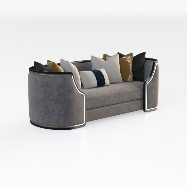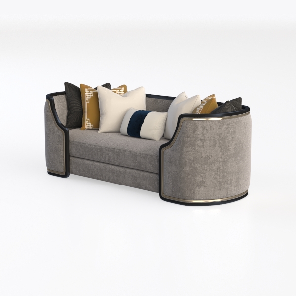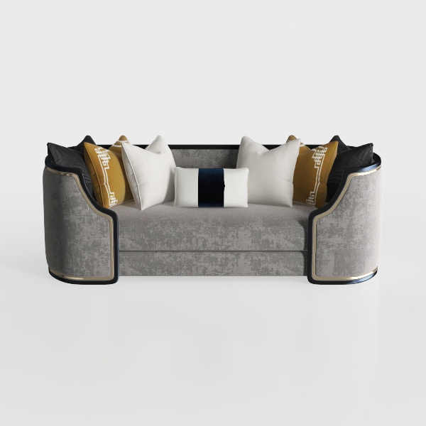 This sofa draws inspiration from the harmonious blend of mid-century modern fluidity and contemporary refined details, merging the warm charm of vintage design with the sleekness of modern aesthetics. Crafted with a soft, textured gray upholstery, its surface feels sumptuously plush to the touch—cloud-like in softness yet subtly resilient, with a delicate weave that catches light gently, adding depth to its neutral base. The armrests and back edges are accented with matte gold metal trim, curving gracefully to frame the silhouette, while the deep, rounded corners enhance its inviting, hug-like presence.