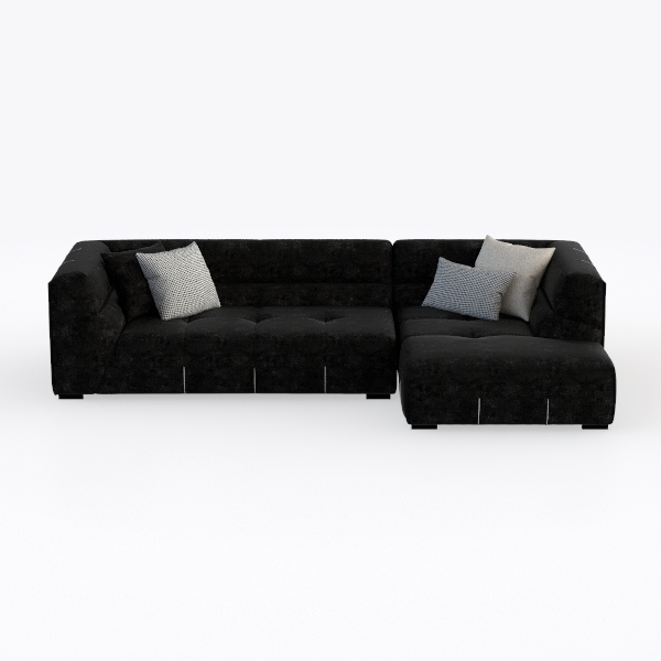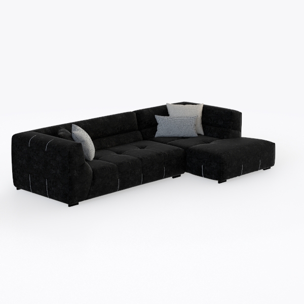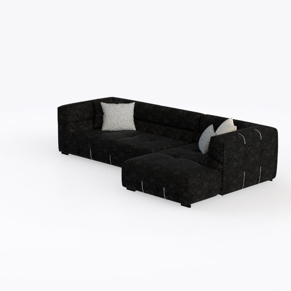 This elegant L-shaped sofa blends modern minimalism with timeless comfort, drawing inspiration from the clean lines of contemporary design and a focus on functional luxury. Its deep, rich black upholstery features a sumptuously soft, textured fabric that feels plush to the touch—velvety yet smooth, catching light gently to create a subtle, sophisticated sheen. The frame’s sleek, low-profile silhouette and symmetrical tufting add structured charm, while the curved arms soften the edges, balancing strength with approachability.