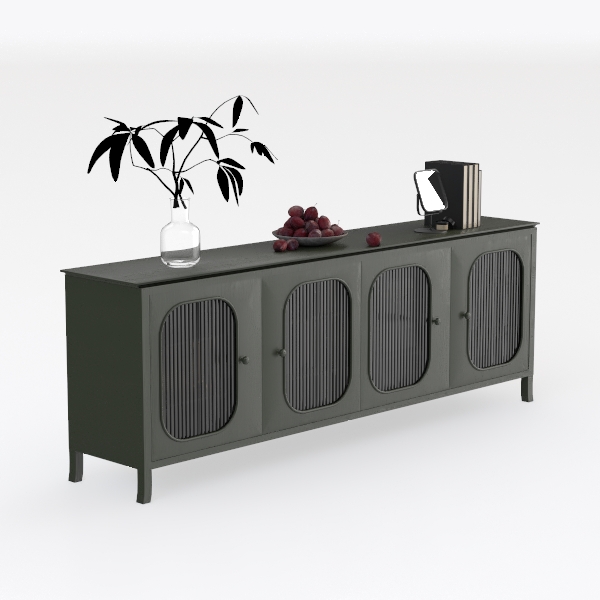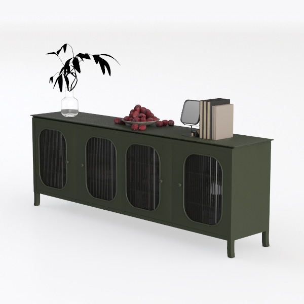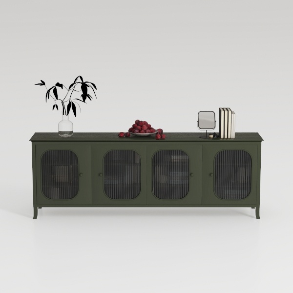 Inspired by nature's earthy tones and clean lines, this cabinet blends organic warmth with modern simplicity. Its matte dark green finish offers a smooth, tactile surface, while the striped glass doors add subtle transparency, balancing solidity and lightness visually. Ideal for a Scandinavian or modern minimalist living room, it pairs beautifully with marble side tables and metallic lamp bases, featuring four glass-fronted doors for organized storage and curated decor display.