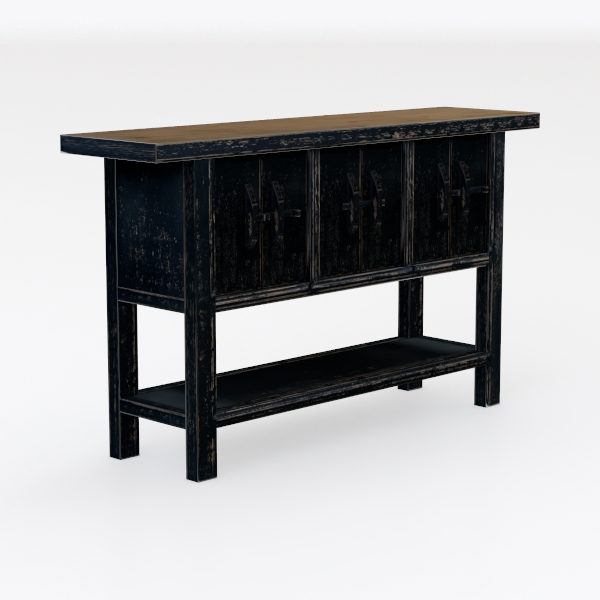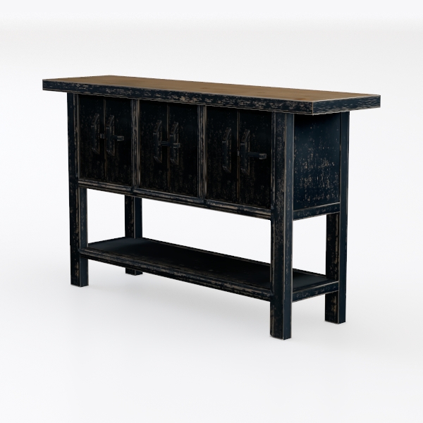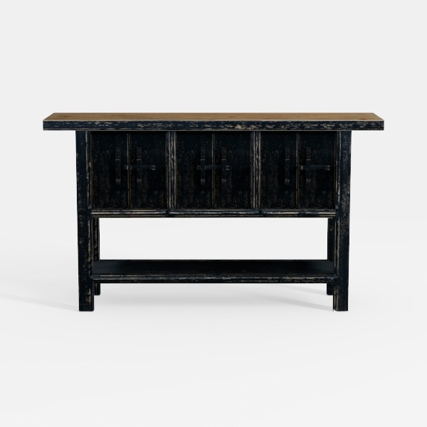 Inspired by traditional craftsmanship, this cabinet features a warm wooden top contrasting with a distressed black finish, creating striking visual depth. Its textured surface and symmetrical layout add character, making it perfect for a cozy living room or study, complementing both industrial and bohemian styles. Multiple closed compartments offer ample storage, while the spacious lower shelf provides versatile display space, blending vintage charm with practicality.