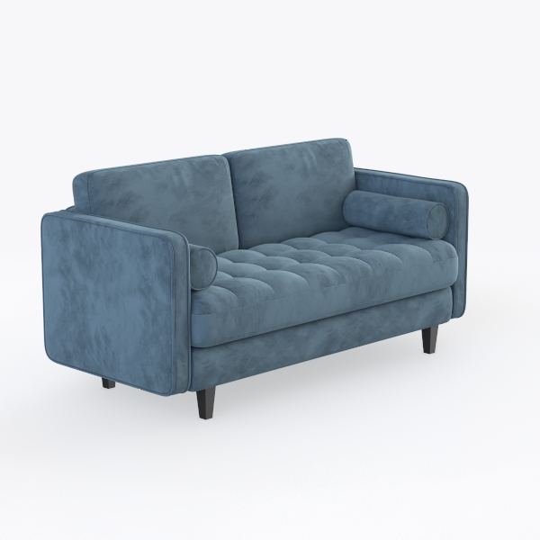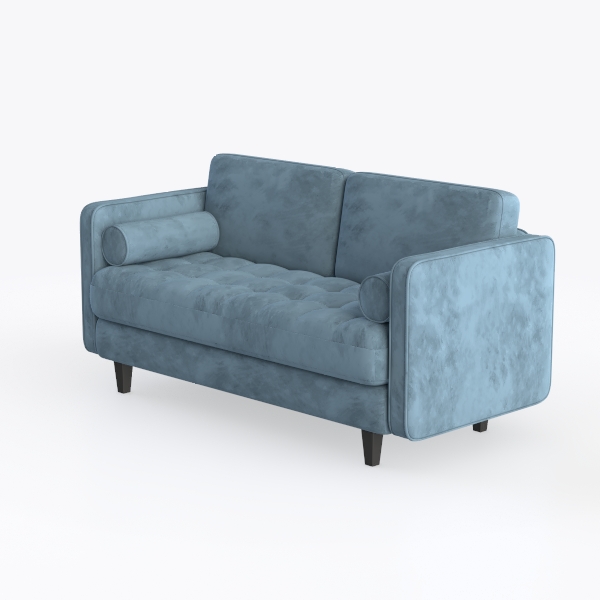 Crafted from a plush, velvety fabric in a soft sky-blue tone, the surface feels surprisingly lightweight yet deeply comforting—like resting on a cloud. Subtle tufting on the backrest and seat adds textural interest without overwhelming, catching light softly to create a warm, inviting glow. The low-profile design, paired with slim, black tapered legs, keeps the overall look airy and unobtrusive, avoiding heaviness.