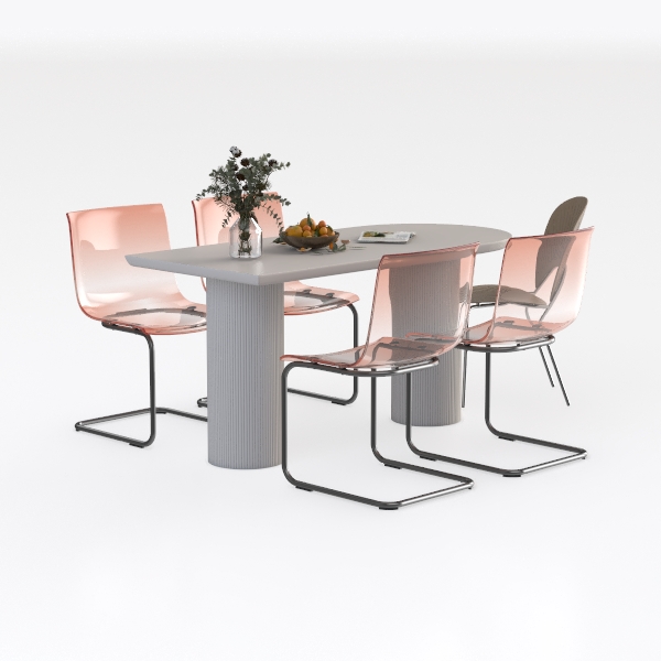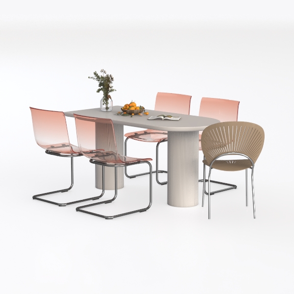 Inspired by the harmony of soft minimalism and structural clarity, this dining collection draws from the quiet beauty of everyday moments—like sunlight filtering through a window or the gentle curve of a well-loved chair. The centerpiece, an oval table, features a smooth, luminous surface that feels cool to the touch, complemented by slender, ribbed columns that rise from its base, adding subtle texture without overwhelming the eye. Flanking the table are four translucent pink chairs, their lightweight frames and gently curved backs evoking a sense of airiness, while a fifth chair, upholstered in warm beige fabric with a woven pattern, introduces organic softness.