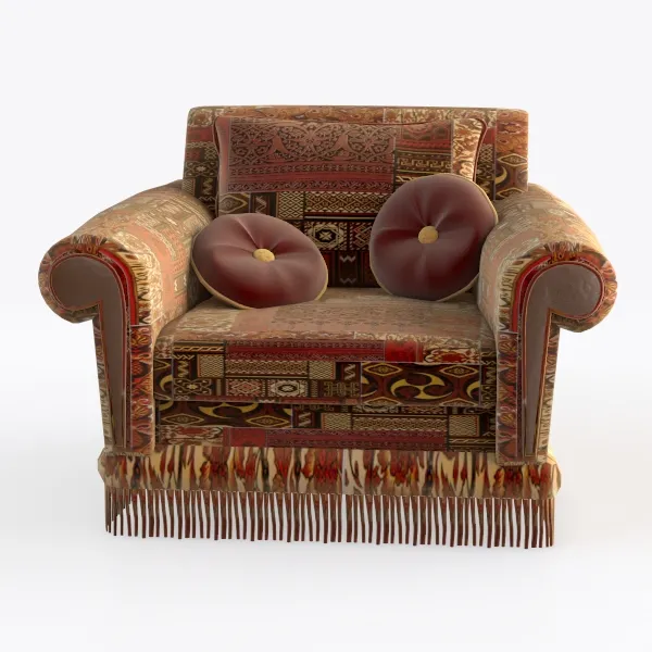 This armchair draws inspiration from traditional craftsmanship and cultural motifs, seamlessly blending artistry with functionality. Covered in a rich, patterned fabric, it evokes a warm, inviting atmosphere, perfect for cozy gatherings. The texture offers a delightful touch—a soft, plush feel that invites you to sink in and unwind.