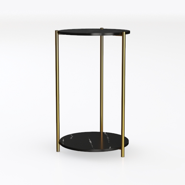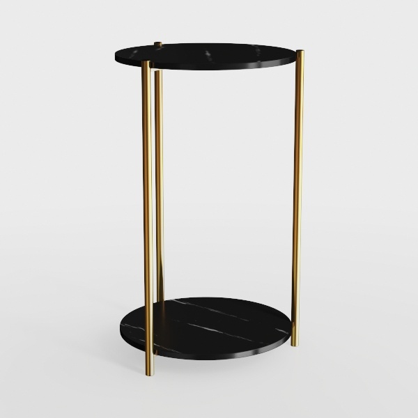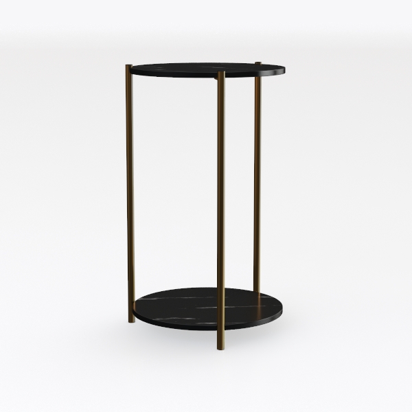 Inspired by mid-century modern minimalism, this elegant side table features black, glossy marble-like surfaces with subtle veining, paired with slim gold-plated legs. Ideal for modern living rooms or bedrooms, it blends sleek style with practicality—two tiers offer space for drinks, books, or decor, enhancing minimalist or sophisticated interiors.