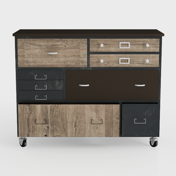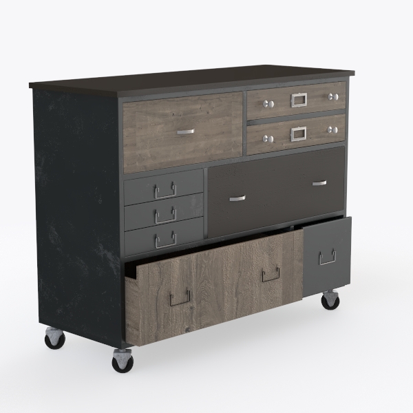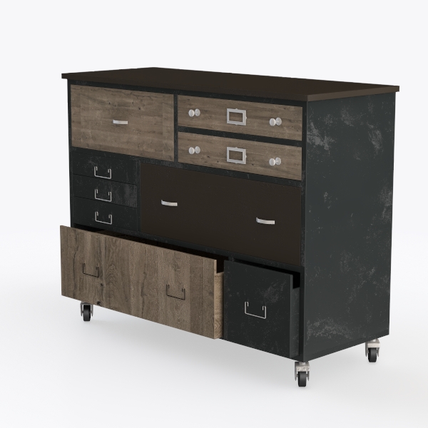 Blending industrial charm with rustic warmth, the design draws inspiration from vintage workshop storage, merging functionality with aesthetic appeal. Textures vary—smooth, grainy wood and matte dark surfaces—with sleek metal handles adding polish. Rolling casters allow easy mobility, while multiple drawers (varied depths) offer ample storage, ideal for modern industrial living rooms or studies, pairing well with marble side tables and leather armchairs.