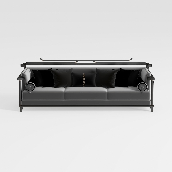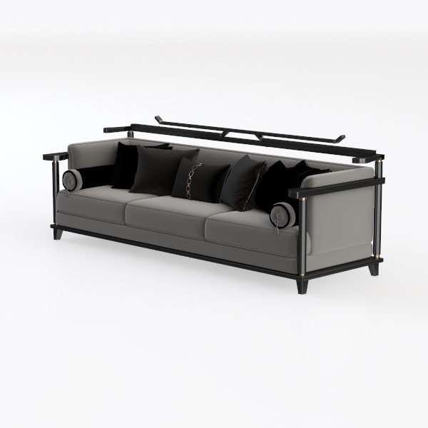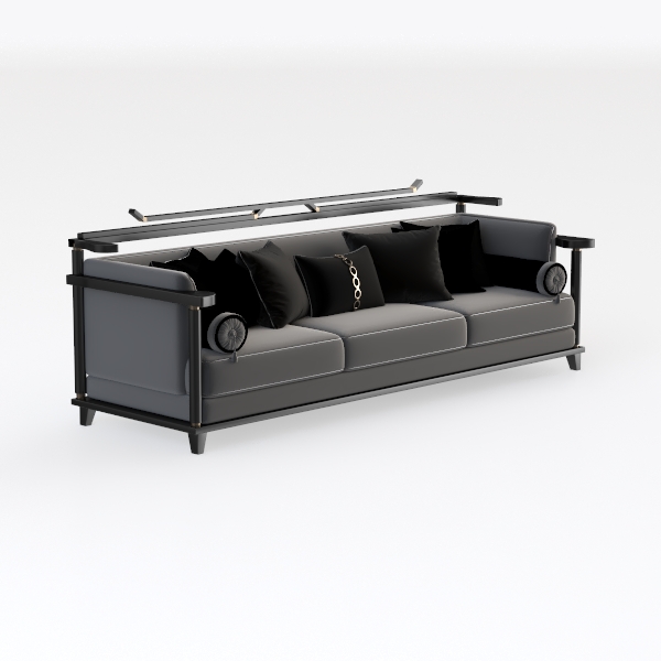 Visually, the sofa makes a striking statement: the clean lines of its frame, paired with the generous expanse of its seat, create a sense of openness, while the black and gray contrast, accented by the metallic gold, feels both sophisticated and approachable. It’s a versatile centerpiece, ideal for a modern-luxe living room, where it pairs beautifully with marble coffee tables, black metal floor lamps, and geometric-patterned rugs, enhancing the space’s refined, ordered atmosphere.