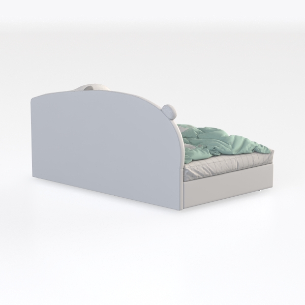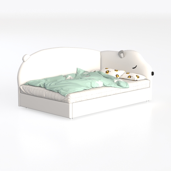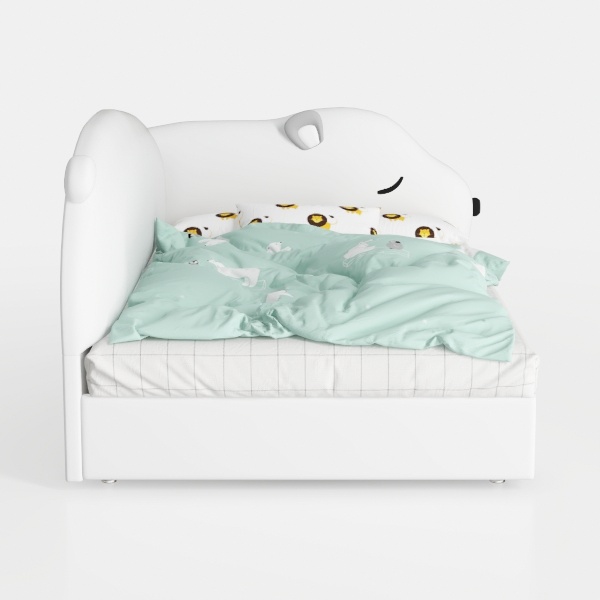 Designed with childlike wonder, the headboard mimics a cuddly bear, evoking warmth and safety. Its smooth, white surface contrasts softly with mint-green bedding dotted with playful animal prints, creating a gentle, inviting vibe. Perfect for a dreamy kids' room, it pairs beautifully with soft rugs and fairy lights, while a sturdy frame and under-bed storage add practical charm.