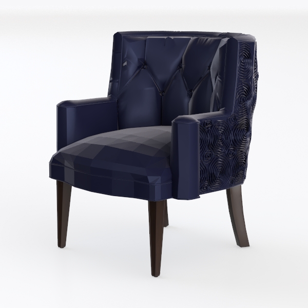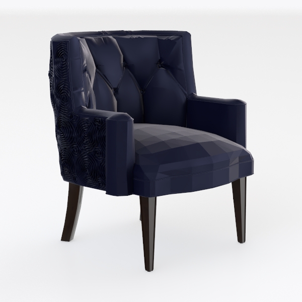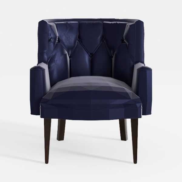 Elegantly blending mid-century modern warmth with contemporary sophistication, this armchair takes cues from classic wingback silhouettes reimagined through a streamlined, geometric lens. Its deep navy upholstery—with a soft, velvety texture and a hint of subtle luster—feels both opulent and approachable, while the artfully placed button tufting on the backrest adds intentional depth without overwhelming the design. The low, angular seat cushion, curved gently to cradle the body, pairs seamlessly with slim, dark wood legs, creating a balanced, grounded profile that feels both substantial and light.