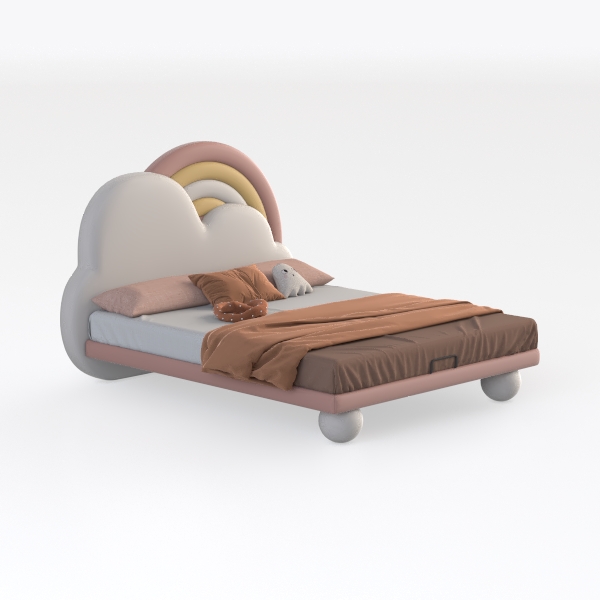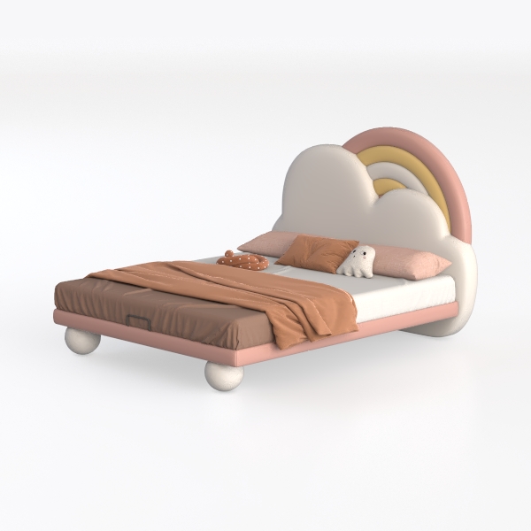 Designed to spark childhood dreams, this bed features a cloud-shaped headboard with a soft rainbow arc, blending natural warmth and playful charm. The smooth, plush cloud surface with blush, white, and buttery yellow hues creates a cozy, inviting look. Ideal for a kids' room, it pairs with soft brown bedding and cute toys, enhancing a sweet vibe. Sturdy and stable, the cloud design adds whimsy, making bedtime feel magical.