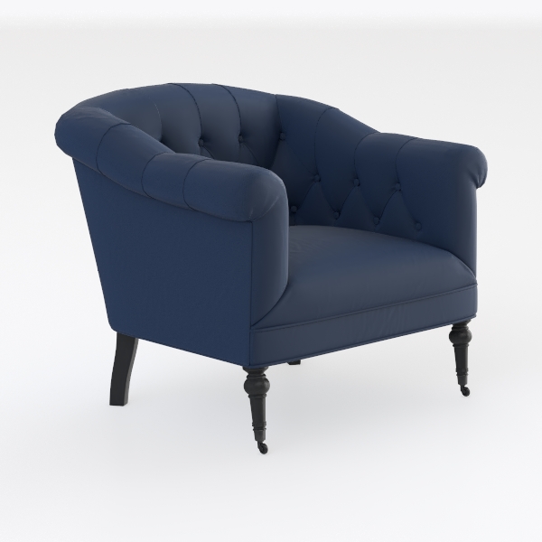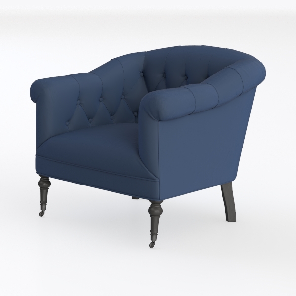 The deep navy upholstery is a study in tactile luxury: soft, with a subtle sheen that catches light, it invites gentle touches. Each button tuft is meticulously stitched into a neat diamond pattern, adding dimensional texture without overwhelming the eye, while the plush, curved armrests cradle the body, promising cozy support. The rich blue hue exudes calm sophistication, its warm undertones complementing both warm wood tones and neutral palettes, while the dark, turned wood legs ground the piece in stability, balancing ornate elegance with understated sturdiness.