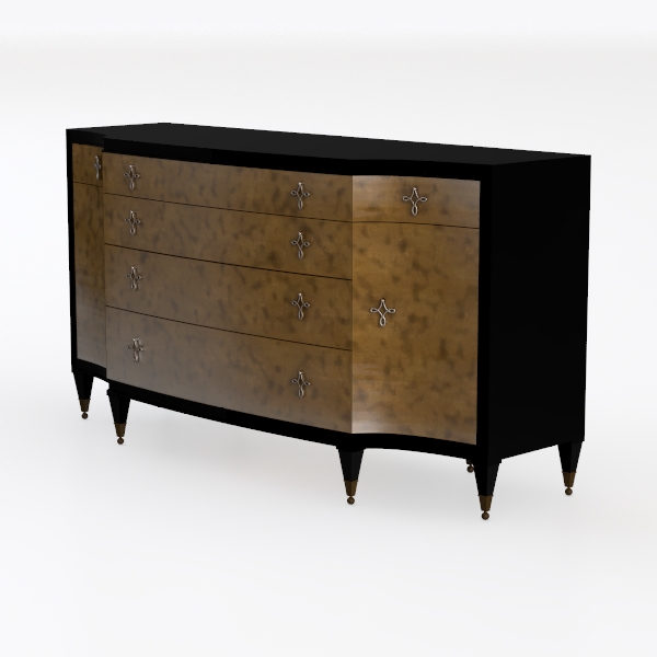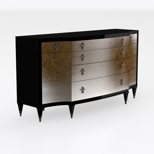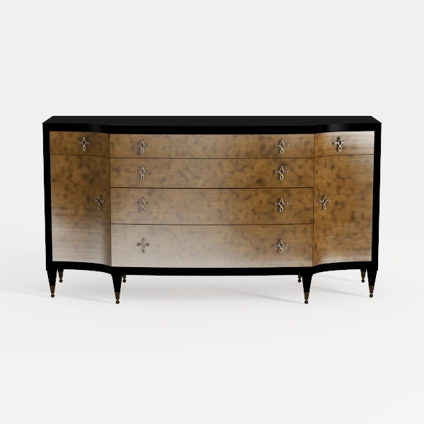 Inspired by vintage craftsmanship, this cabinet blends timeless elegance with modern minimalism. Its smooth, warm wood grain surface, paired with sleek black edges and polished silver cross handles, creates a refined visual contrast. Perfect for a contemporary classic living room, ideal with marble side tables and gold-accented lighting. Spacious drawers offer ample storage, while slim black legs with gold tips add a touch of lightness to the design.
