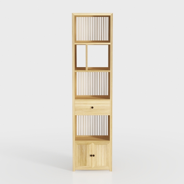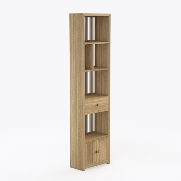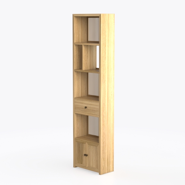 Drawing inspiration from natural simplicity, this wooden shelf blends warm tones and clean lines. Its smooth, sanded surface offers tactile warmth, with open and closed compartments creating a balanced visual rhythm. Ideal for minimalist or Scandinavian living rooms/studies, pair it with potted plants and linen cushions. Spacious shelves store books/decor, a drawer and cabinet add hidden storage, enhancing style and utility.