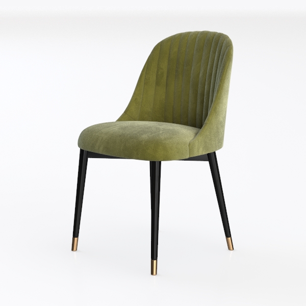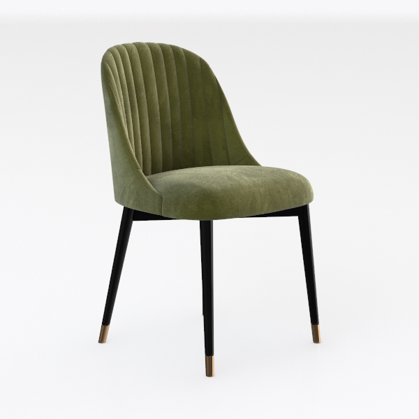 Inspired by organic curves, this chair blends softness with modern elegance. Plush, velvety upholstery offers a tactile delight, while the deep green hue adds warmth and sophistication. Ideal for a contemporary dining room or living area, it pairs beautifully with marble tables and metallic accents. A contoured seat and sturdy black legs with gold-tipped feet ensure both comfort and stability.