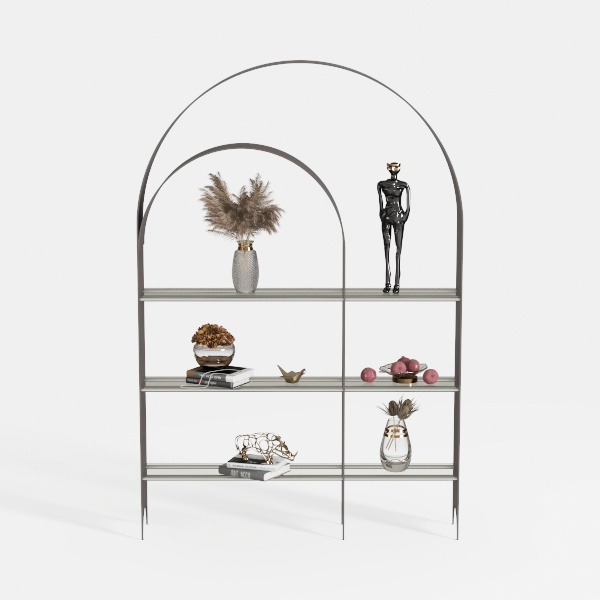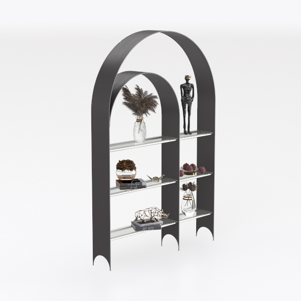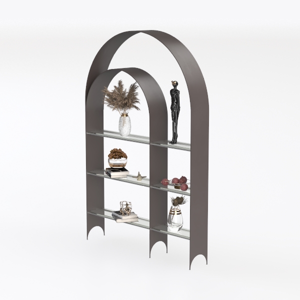 Drawing inspiration from architectural archways, this elegant shelf blends sleek metal frame with matte finish and transparent glass shelves, creating a light yet sturdy feel. Curved top adds softness, balancing modern elegance with subtle warmth. Ideal for modern minimalist luxury living rooms, pair with marble accents and metallic decor. Multiple tiers offer ample space to display books, art, and plants, merging function with style.