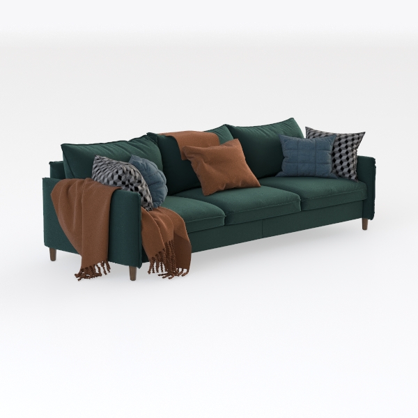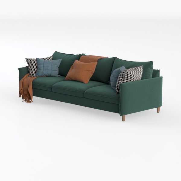 This sofa embodies a blend of modern simplicity and organic warmth, drawing inspiration from the soft, earthy tones of a sunlit woodland—its rich teal upholstery evokes the depth of moss and ferns, creating a serene focal point. The fabric feels surprisingly tactile, with a subtle, velvety texture that invites gentle caresses, while the muted hue softens the space, catching light to add delicate depth. Plump, generously sized cushions, accented with a mix of throw pillows—textural contrasts of a weathered blue linen, a warm terracotta, and a geometric black-and-white print—add visual interest without clutter, balancing structure and coziness.
