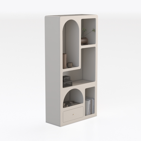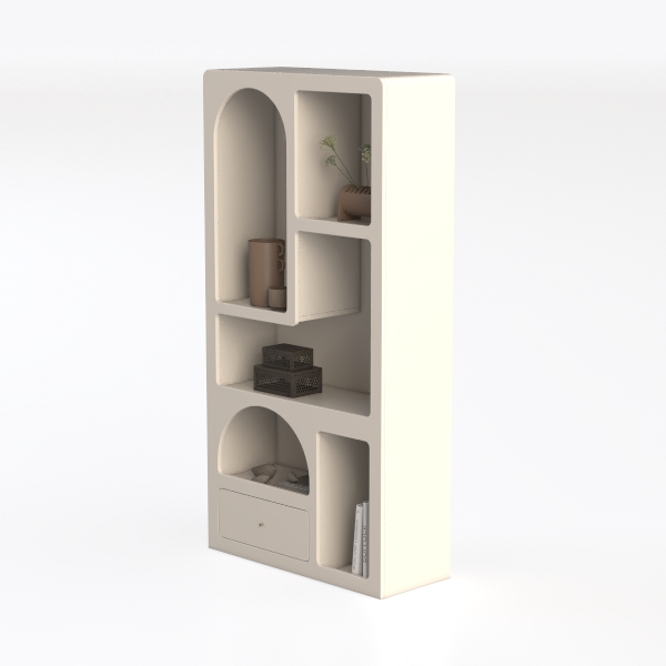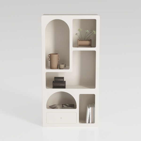 Inspired by mid-century modern design, this shelving unit blends soft arches and geometric cutouts. Its smooth matte white surface and warm lines create a minimalist, inviting vibe. Ideal for modern or Scandinavian living rooms, pairing beautifully with marble accents and potted greens. Spacious compartments and a hidden drawer offer practical storage, balancing style and utility.