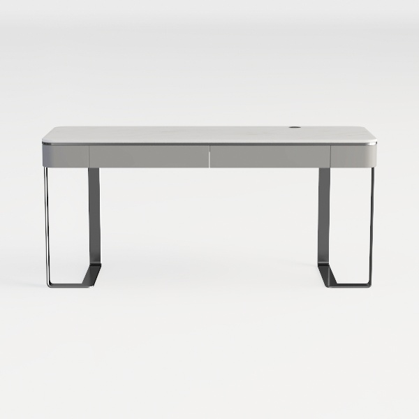 Inspired by minimalist architecture, this piece blends clean lines with functional elegance. Its sleek, matte surface contrasts with polished metal legs, offering a cool, tactile experience and refined visual appeal. Ideal for a contemporary home office or living room, it pairs seamlessly with leather chairs and geometric decor, while integrated drawers provide hidden storage, balancing aesthetics with practicality.
