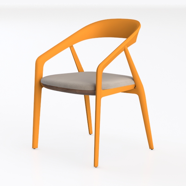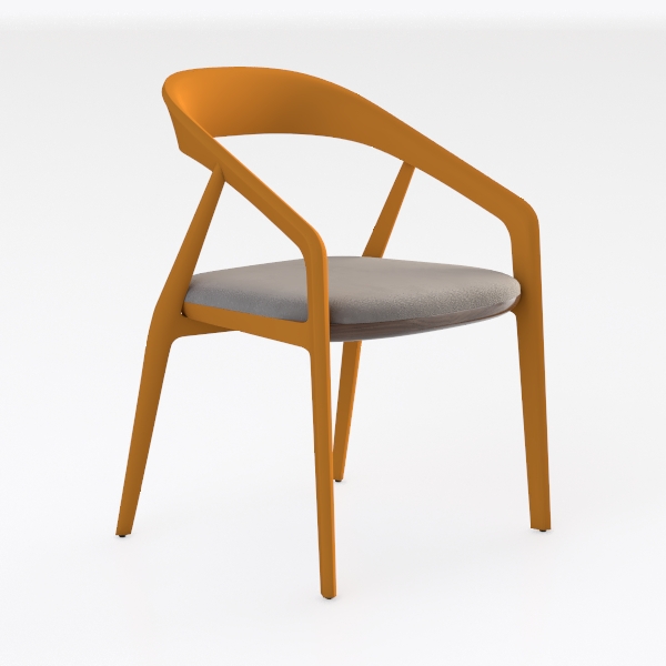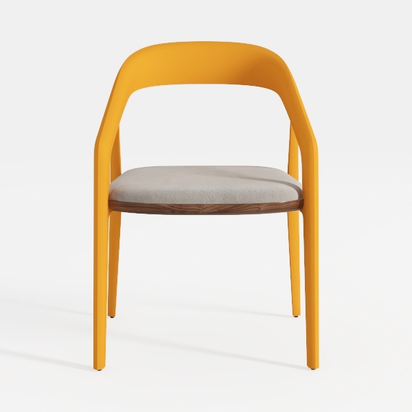 Designed with organic curves, this chair merges minimalist style and practical comfort. Sleek yellow legs, soft gray upholstery, and a subtly grained wooden seat edge create a balanced, inviting look. Ideal for modern dining rooms or cozy living spaces, pairing with wooden tables and neutral decor, while a generous seat depth offers optimal comfort, with the curved back gently supporting natural posture.