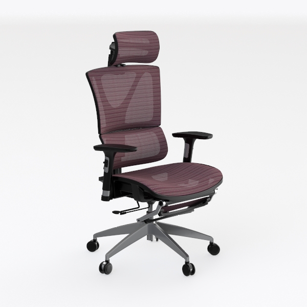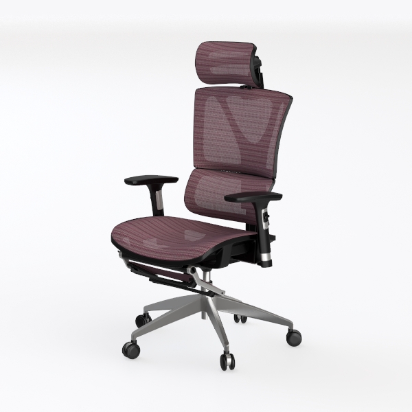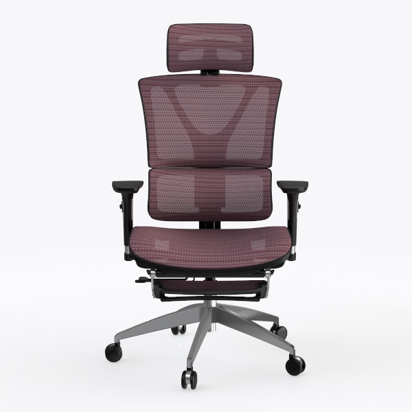 Inspired by ergonomic design, this chair features a breathable mesh backrest with soft, supportive touch in deep burgundy. Matte black armrests and a matte silver base add modern sleekness, while smooth-rolling casters ensure easy movement. Ideal for minimalist home offices, it pairs with wooden desks and metallic accents, with adjustable headrest and retractable footrest for all-day comfort.