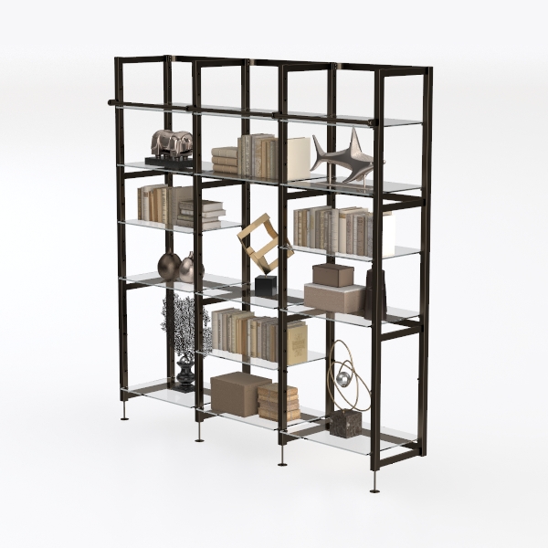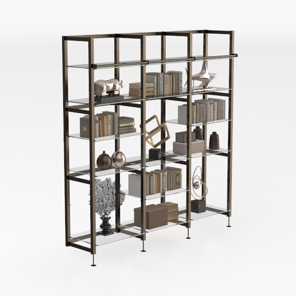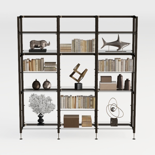 Blending industrial structure with organic decor, this shelving unit features cold-toned metal frames and clear glass shelves, creating a sleek, balanced look. Warm-toned books and sculptural pieces add texture, inviting a tactile mix of hardness and softness. Ideal for modern industrial living rooms or studies, it pairs well with leather sofas and wooden tables, while spacious open shelves and sturdy frames ensure durability and display versatility.