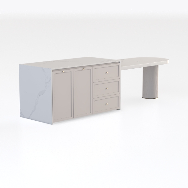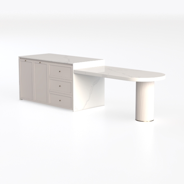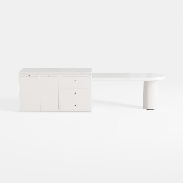 Crafted with minimalist Scandinavian design, blending soft curves and clean lines. Its smooth matte surface feels cool to the touch, with subtle metallic drawer pulls adding delicate contrast. Light and airy, the all-white palette enhances spaciousness, while the curved tabletop softens the rigid structure. Ideal for modern home offices or living rooms, pair with warm wood accents and metallic lamp bases. Three drawers and two cabinets offer ample storage, with smooth gliding hardware ensuring easy access to essentials.