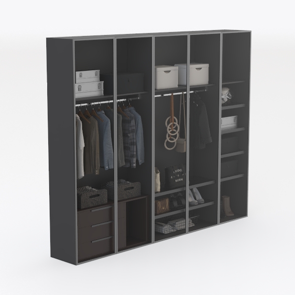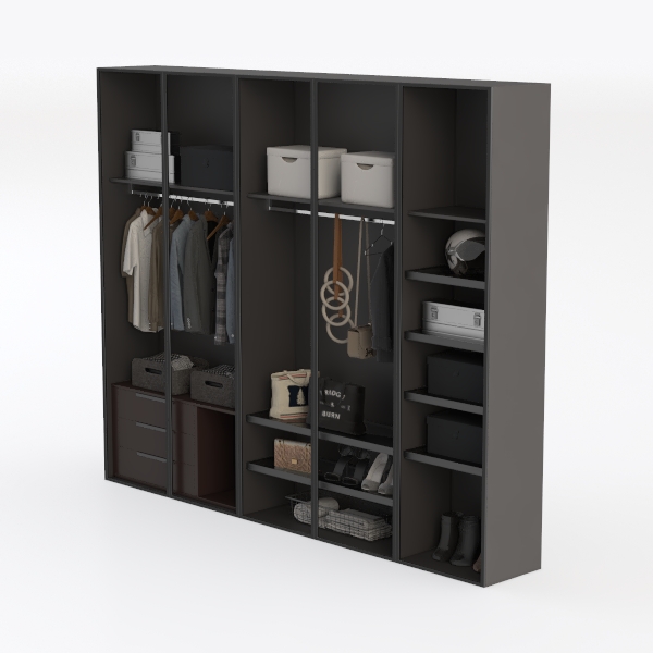 Inspired by minimalist design, this wardrobe blends functionality with clean lines. Crafted from smooth matte panels and sleek metal handles, it features a dark hue that adds depth, while structured compartments—hanging rails, drawers, and woven baskets—keep items organized. Ideal for modern bedrooms, it pairs with warm wood and soft lighting, enhancing its calm, clutter-free vibe.