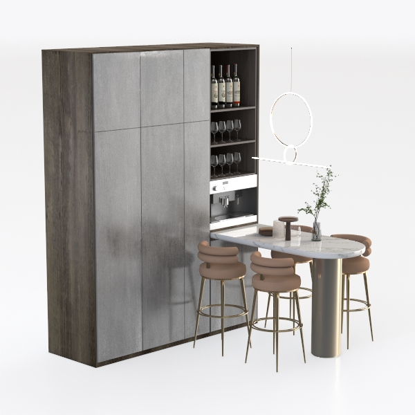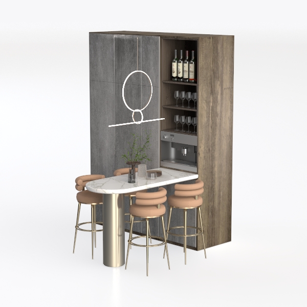 Blending urban minimalism with warm textures, this home piece features sleek gray cabinet doors with subtle texture, paired with polished marble countertop and gold metal legs. Ideal for compact spaces, it elevates modern industrial or contemporary kitchenettes, complementing sleek appliances. Ample storage holds wine and glasses, while the round countertop offers a cozy spot for casual meals or evening drinks, with soft upholstered bar stools enhancing comfort.