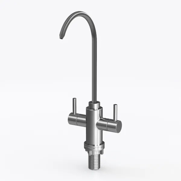 A 3D model of a Sink Faucet, featuring stainless steel construction, curved spout, dual-handle design and a modern, sleek aesthetic. It has high-precision engineering and is suitable for kitchen or bathroom use.