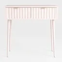 This elegant piece draws inspiration from the interplay of organic vertical patterns and geometric precision, reimagining classic slatted designs with a contemporary, streamlined twist. Crafted with a smooth, matte white finish, its surface feels cool and refined to the touch, while the vertical slats create subtle visual rhythm, catching light to add depth without overwhelming the space. The slender, tapering legs, also in matte white, elevate the piece, infusing it with a sense of lightness that contrasts beautifully with the compact, two-drawer structure.