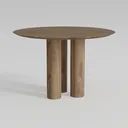 Inspired by organic forms and architectural minimalism, this wooden table features warm, natural wood grain with smooth, tactile surfaces. Soft, earthy tones create a serene presence, ideal for a modern minimalist living room or dining space. Its spacious circular top accommodates gatherings, while the textured column base ensures stability and subtle visual interest, pairing seamlessly with neutral sofas, potted plants, and sleek metal accents.