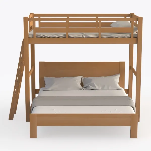 Inspired by space-saving living, this wooden bunk bed blends function and warmth. Smooth, natural wood texture offers tactile comfort; light brown hue creates a cozy, inviting vibe. Ideal for family bedrooms, it pairs with soft linen and warm lighting, enhancing modern or Scandinavian styles. Lower full bed suits adults, upper twin with a safe ladder adds versatility, maximizing space efficiently.