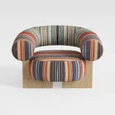 Beneath the plush seat, a smooth oak base grounds the piece, its light, natural grain complementing the bold stripes and infusing the chair with warmth. It thrives in versatile settings: a modern bohemian living room, where it pairs effortlessly with neutral-toned sofas, marble coffee tables with brass accents, and a jute rug, balancing its vibrancy with understated elegance. In a retro-modern reading nook, it becomes the centerpiece, its playful stripes contrasting charmingly with vintage-inspired wooden shelves and a floor lamp with a ceramic shade.