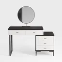 Designed with modern minimalism, this vanity blends clean lines and symmetry, inspired by Scandinavian simplicity. Sleek white drawers with a smooth matte finish contrast the dark polished top; slender metallic legs add sophistication, creating a bright, grounded look. Ideal for a contemporary bedroom, pairing with soft textiles and warm lighting. A round mirror and multiple drawers offer ample storage for beauty essentials, balancing function and elegance.