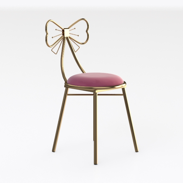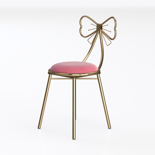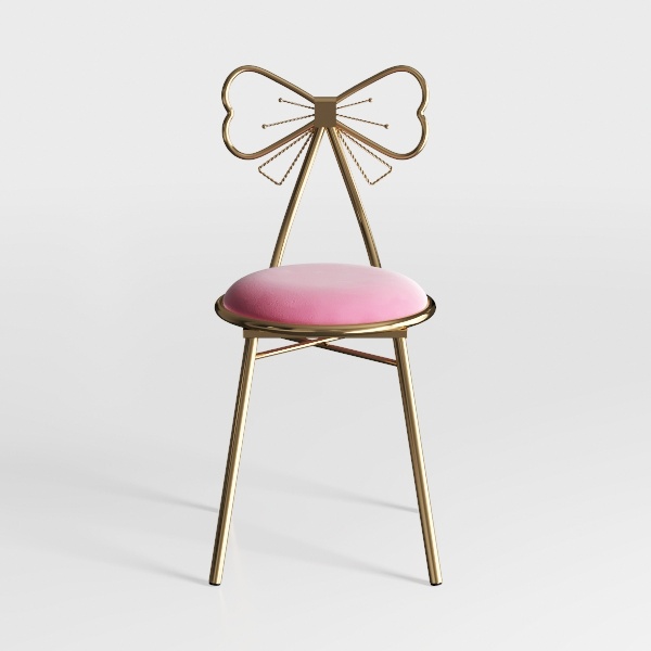 This charming chair draws inspiration from the delicate curves of vintage decor and the whimsical allure of butterfly wings, blending timeless elegance with playful character. Its frame, crafted from polished gold metal, features a graceful bow-shaped backrest—sleek and reflective, catching light to add a touch of opulence. The seat, upholstered in soft pink velvet, offers a warm, tactile contrast, inviting gentle contact and enhancing the overall cozy vibe.