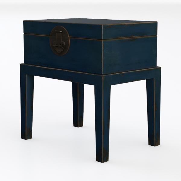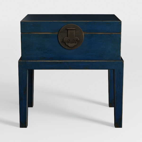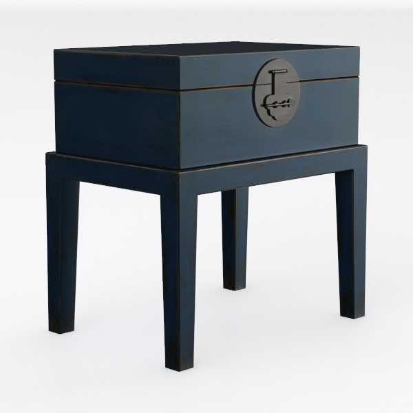 This timeless piece draws inspiration from traditional storage furniture, blending the utilitarian charm of vintage trunks with the clean lines of modern design. Its deep, oceanic blue finish, achieved through a meticulous distressing process, reveals subtle wood grain patterns beneath a smooth, slightly worn surface, evoking a sense of history and warmth. The centerpiece—a polished, antique-bronze clasp—adds a touch of understated luxury, its curved edges and intricate detailing contrasting beautifully with the furniture’s matte texture.