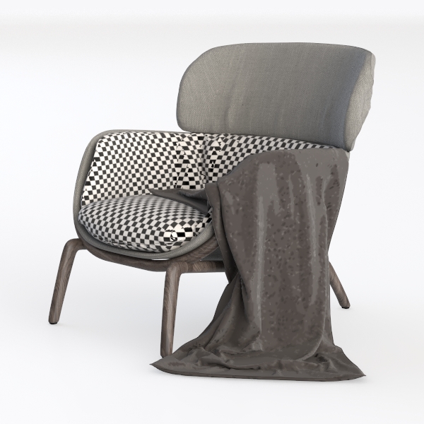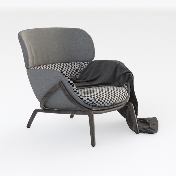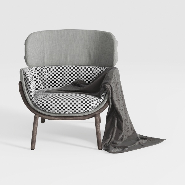This elegant armchair embodies a harmonious blend of organic design and geometric precision, drawing inspiration from the interplay of natural textures and structured patterns. Its curved wooden frame, with warm, earthy tones and subtle grain details, evokes the tactile charm of handcrafted artisanal pieces, while the smooth, slightly textured fabric backrest and seat cushion offer a soft, inviting surface that feels both premium and comfortable to the touch. The striking black-and-white checkered pattern on the seat adds a playful yet sophisticated visual contrast, creating depth and energy against the neutral backdrop of the chair’s frame and the draped gray silk-like fabric, which cascades gently to enhance its relaxed, lived-in allure.