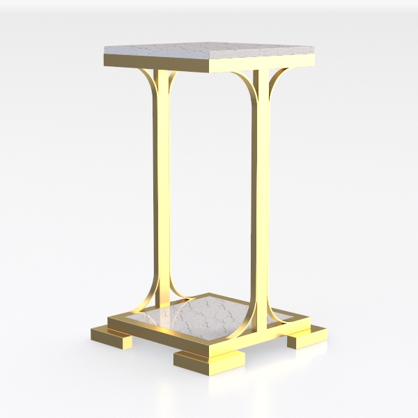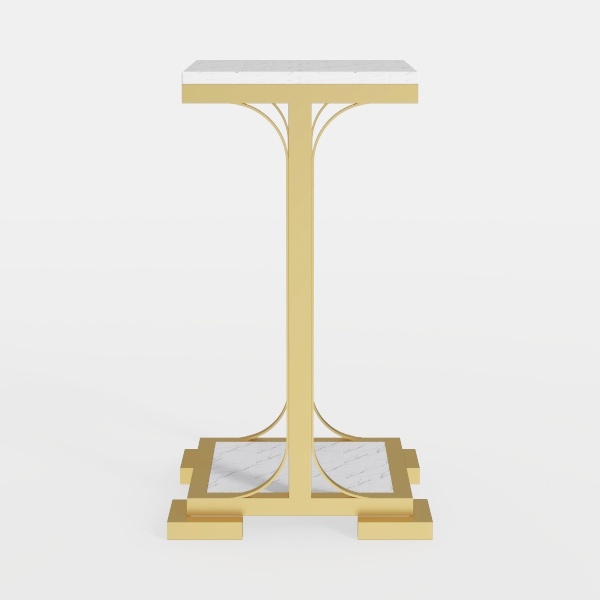 This elegant side table draws inspiration from the flowing, sinuous lines of Art Nouveau design, merging the organic beauty of natural forms with contemporary simplicity. Its top and base feature smooth, subtly veined white marble, its cool, creamy surface creating a striking contrast to the warm, polished gold metal frame. The metal structure, with its gently arcing sides and geometric, balanced base, exudes a sense of lightness despite its solid presence, while the marble’s delicate veining adds depth and a touch of natural artistry to the overall aesthetic.