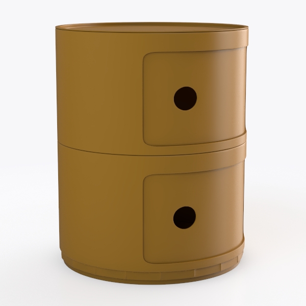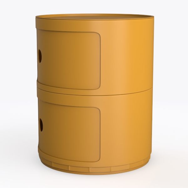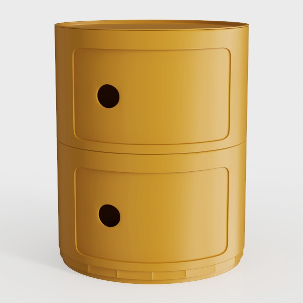 Maybe inspired by organic forms or vintage storage solutions, the cabinet’s cylindrical silhouette and soft golden hue evoke a blend of retro warmth and modern simplicity. The rounded edges and balanced symmetry suggest a connection to natural elements, like smooth river stones or traditional pottery, making it a versatile piece that bridges past and present. Crafted with a smooth, matte finish, the surface feels cool yet inviting to the touch, with subtle depth that catches light gently. The golden-yellow tone, neither too bright nor muted, radiates coziness, while the two rectangular drawers with circular handles add a playful yet elegant contrast, enhancing the cabinet’s approachable charm.